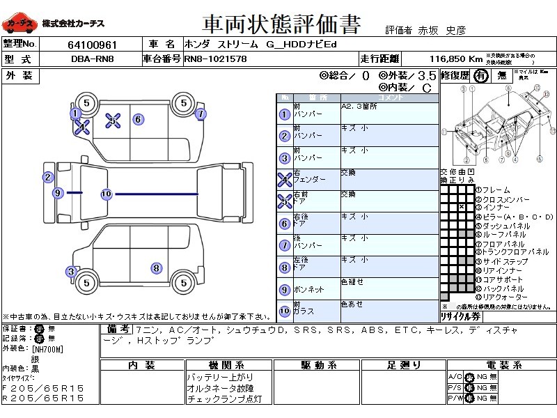 | メーカー・車種 | ホンダ ストリーム G_HDDナビEd (型式:DBA-RN8) | ||||||||||||||||||||||||||||||||||||||||