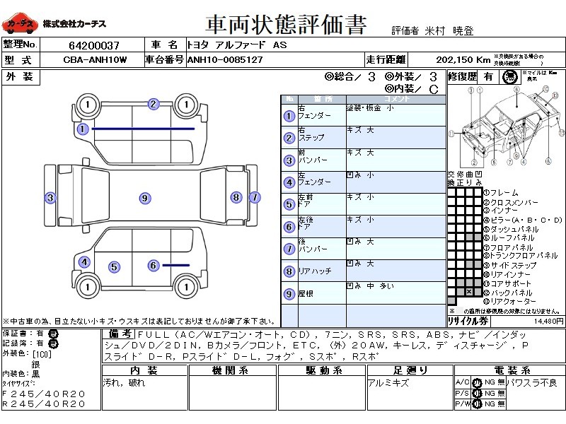 | メーカー・車種 | トヨタ アルファード AS (型式:CBA-ANH10W) | ||||||||||||||||||||||||||||||||||||||||