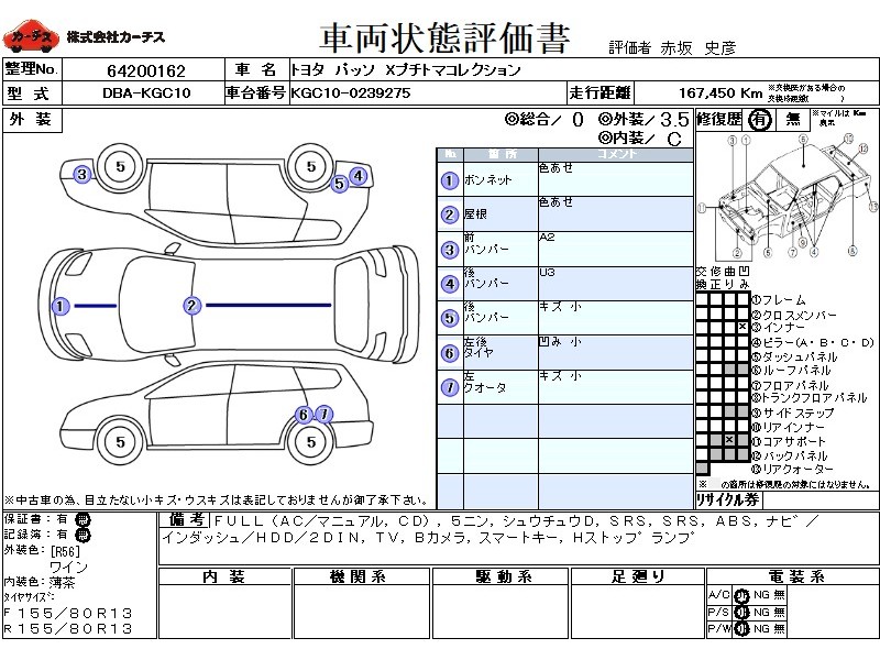 | メーカー・車種 | トヨタ パッソ Xプチトマコレクション (型式:DBA-KGC10) | ||||||||||||||||||||||||||||||||||||||||