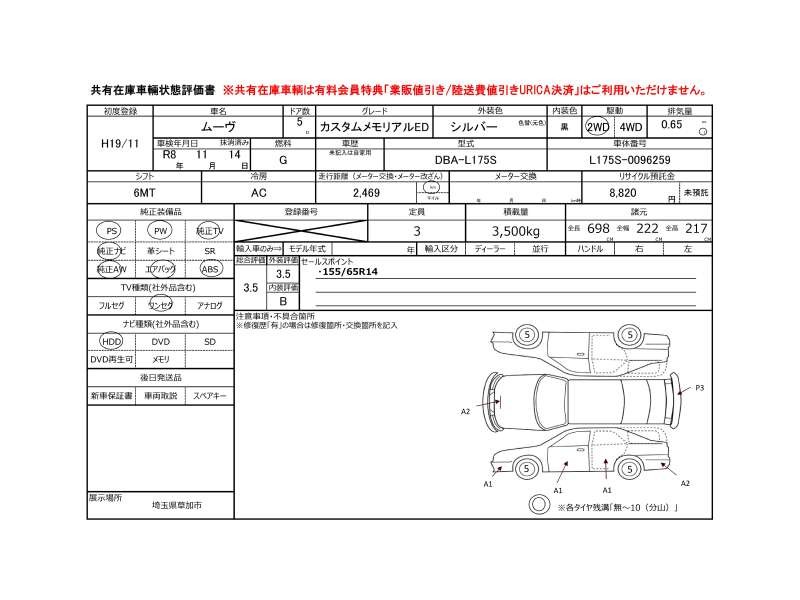| メーカー・車種 | ダイハツ ムーヴカスタム カスタムメモリアルEd (型式:DBA-L175S) | ||||||||||||||||||||||||||||||||||||||||