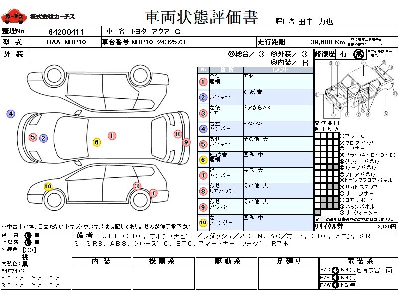 | メーカー・車種 | トヨタ アクア G (型式:DAA-NHP10) | ||||||||||||||||||||||||||||||||||||||||
