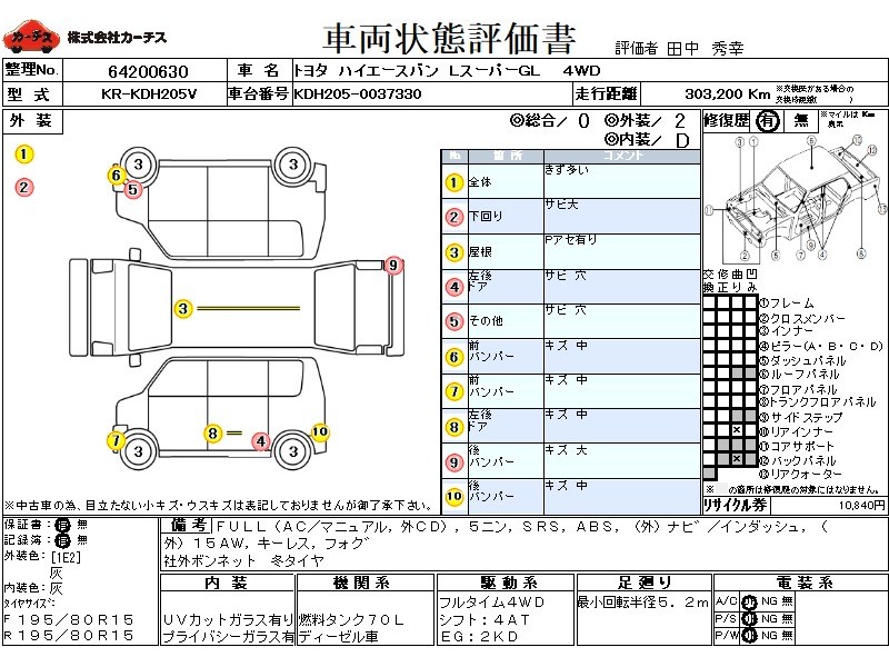 | メーカー・車種 | トヨタ ハイエースバン LスーパーGL (型式:KR-KDH205V) | ||||||||||||||||||||||||||||||||||||||||
