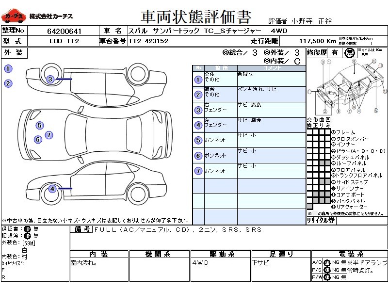 | メーカー・車種 | スバル サンバートラック TC_Sチャージャー (型式:EBD-TT2) | ||||||||||||||||||||||||||||||||||||||||