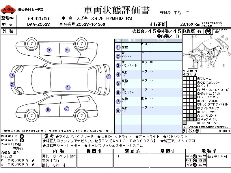 | メーカー・車種 | スズキ スイフト ハイブリッドRS (型式:DAA-ZC53S) | ||||||||||||||||||||||||||||||||||||||||