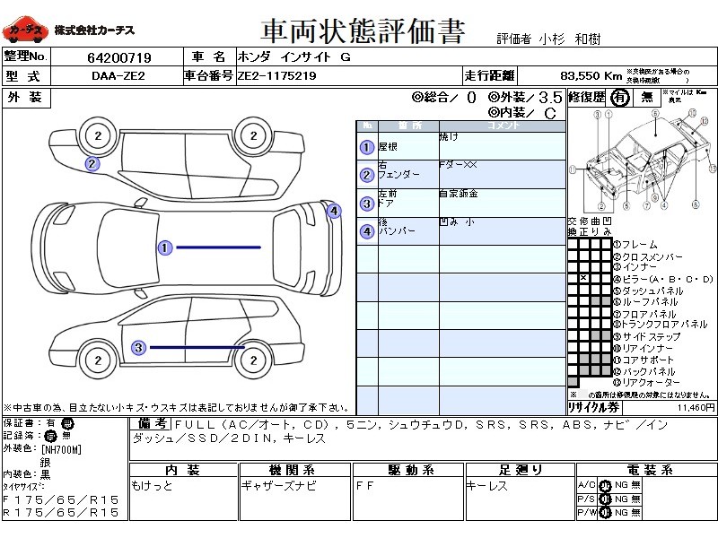 | メーカー・車種 | ホンダ インサイト G (型式:DAA-ZE2) | ||||||||||||||||||||||||||||||||||||||||
