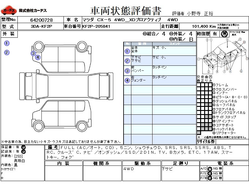 | メーカー・車種 | マツダ CX-5 4WD_XDプロアクティブ (型式:3DA-KF2P) | ||||||||||||||||||||||||||||||||||||||||