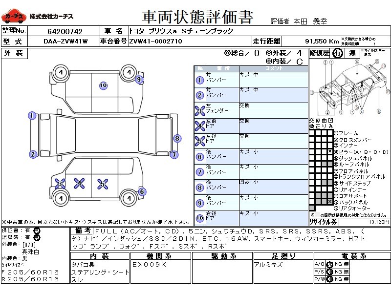 | メーカー・車種 | トヨタ プリウスa Sチューンブラック (型式:DAA-ZVW41W) | ||||||||||||||||||||||||||||||||||||||||