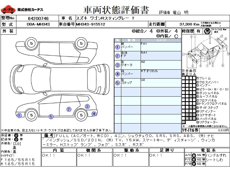 | メーカー・車種 | スズキ ワゴンRスティングレー T (型式:DBA-MH34S) | ||||||||||||||||||||||||||||||||||||||||