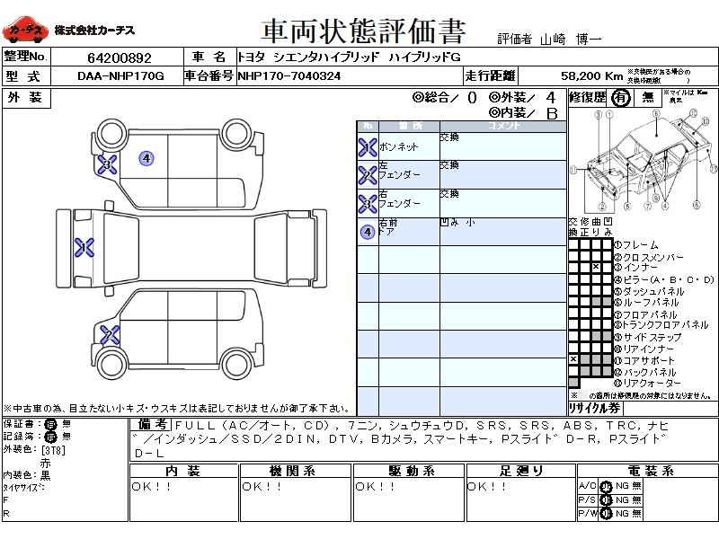 | メーカー・車種 | トヨタ シエンタハイブリッド ハイブリッドG (型式:DAA-NHP170G) | ||||||||||||||||||||||||||||||||||||||||