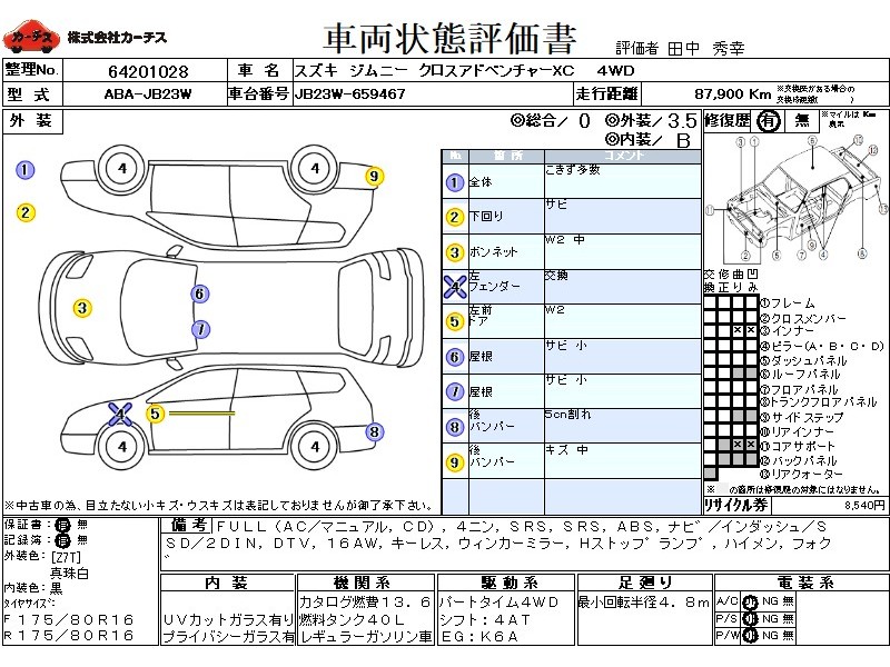 | メーカー・車種 | スズキ ジムニー クロスアドベンチャーXC (型式:ABA-JB23W) | ||||||||||||||||||||||||||||||||||||||||
