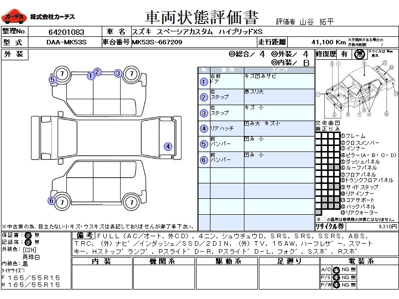 | メーカー・車種 | スズキ スペーシアカスタム ハイブリッドXS (型式:DAA-MK53S) | ||||||||||||||||||||||||||||||||||||||||