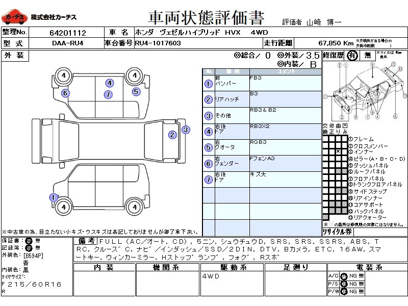 | メーカー・車種 | ホンダ ヴェゼルハイブリッド HVX (型式:DAA-RU4) | ||||||||||||||||||||||||||||||||||||||||