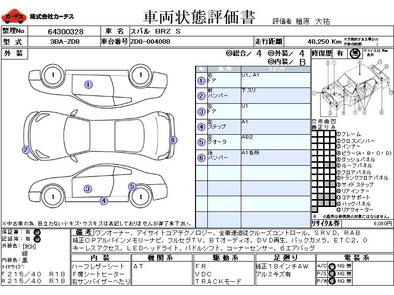 | メーカー・車種 | スバル BRZ S (型式:3BA-ZD8) | ||||||||||||||||||||||||||||||||||||||||