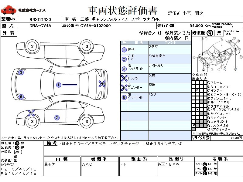 | メーカー・車種 | 三菱 ギャランフォルティス スポーツナビPk (型式:DBA-CY4A) | ||||||||||||||||||||||||||||||||||||||||