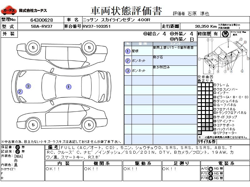 | メーカー・車種 | 日産 スカイラインセダン 400R (型式:5BA-RV37) | ||||||||||||||||||||||||||||||||||||||||