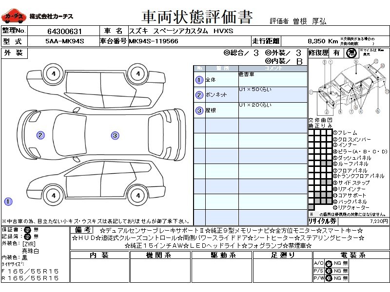 | メーカー・車種 | スズキ スペーシアカスタム HVXS (型式:5AA-MK94S) | ||||||||||||||||||||||||||||||||||||||||