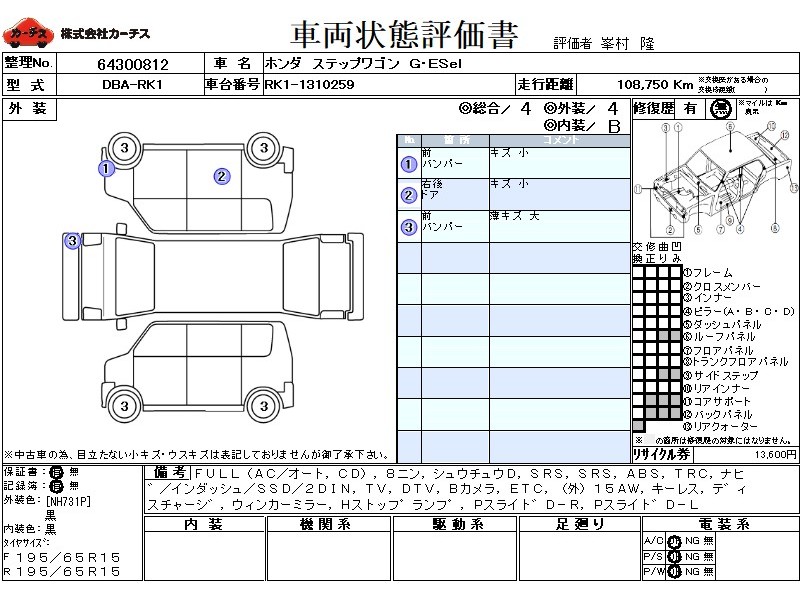 | メーカー・車種 | ホンダ ステップワゴン G・ESel (型式:DBA-RK1) | ||||||||||||||||||||||||||||||||||||||||