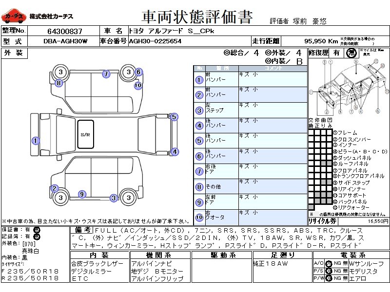 | メーカー・車種 | トヨタ アルファード S_CPk (型式:DBA-AGH30W) | ||||||||||||||||||||||||||||||||||||||||