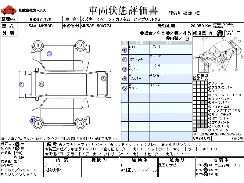 | メーカー・車種 | スズキ スペーシアカスタム ハイブリッドXS (型式:5AA-MK53S) | ||||||||||||||||||||||||||||||||||||||||