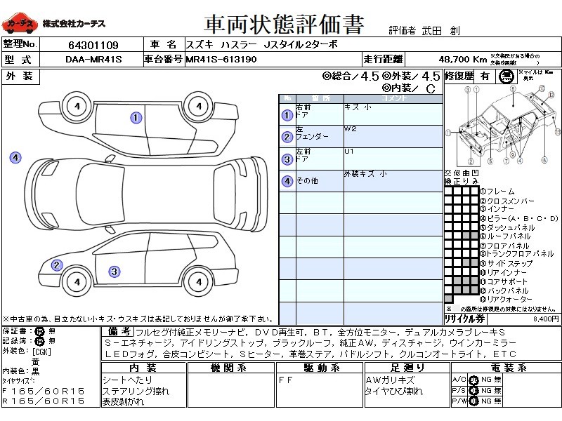 | メーカー・車種 | スズキ ハスラー Jスタイル2ターボ (型式:DAA-MR41S) | ||||||||||||||||||||||||||||||||||||||||