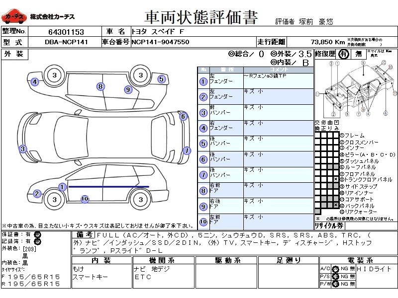 | メーカー・車種 | トヨタ スペイド F (型式:DBA-NCP141) | ||||||||||||||||||||||||||||||||||||||||