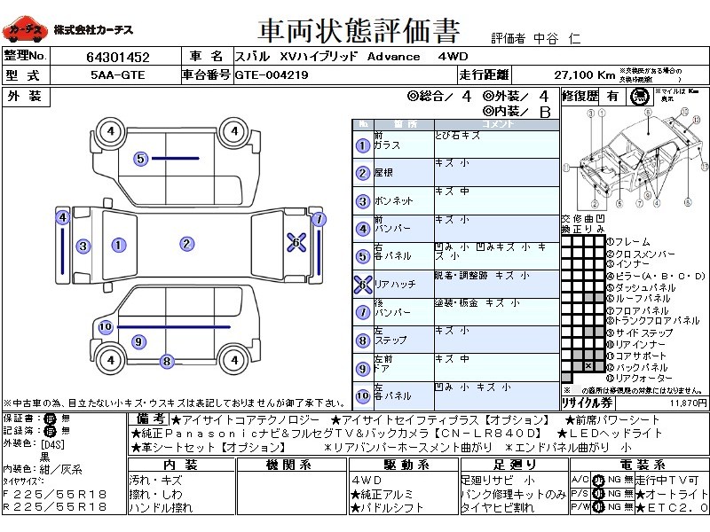 | メーカー・車種 | スバル XVハイブリッド アドバンス (型式:5AA-GTE) | ||||||||||||||||||||||||||||||||||||||||