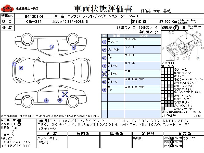 | メーカー・車種 | 日産 フェアレディZクーペ2シーター VerS (型式:CBA-Z34) | ||||||||||||||||||||||||||||||||||||||||