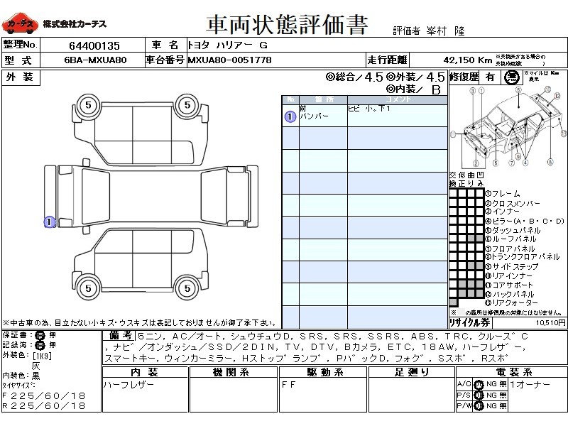 | メーカー・車種 | トヨタ ハリアー G (型式:6BA-MXUA80) | ||||||||||||||||||||||||||||||||||||||||