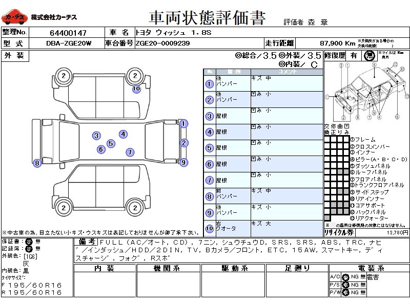 | メーカー・車種 | トヨタ ウィッシュ 1.8S (型式:DBA-ZGE20W) | ||||||||||||||||||||||||||||||||||||||||