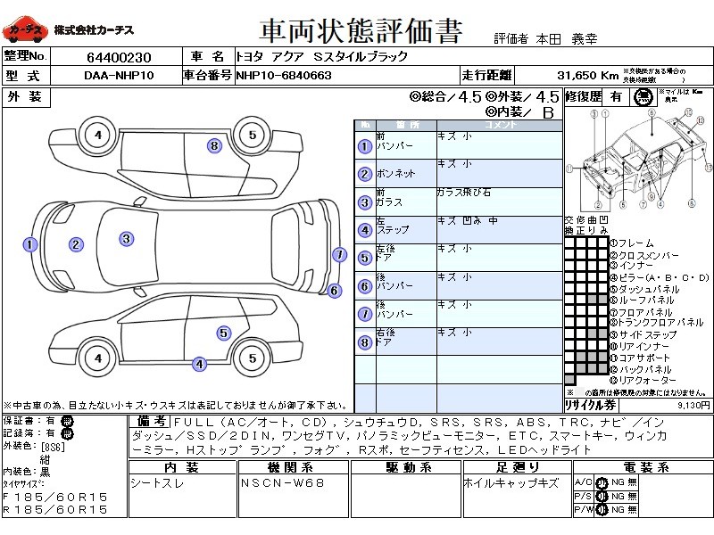 | メーカー・車種 | トヨタ アクア Sスタイルブラック (型式:DAA-NHP10) | ||||||||||||||||||||||||||||||||||||||||