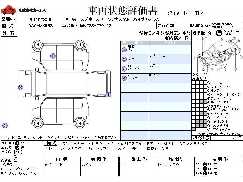 | メーカー・車種 | スズキ スペーシアカスタム ハイブリッドXS (型式:DAA-MK53S) | ||||||||||||||||||||||||||||||||||||||||