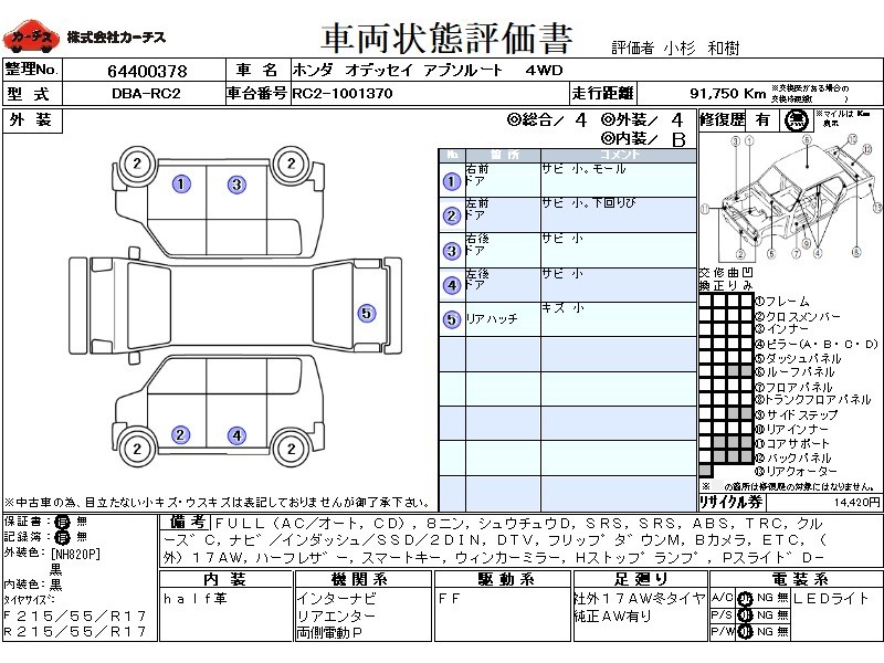 | メーカー・車種 | ホンダ オデッセイ アブソルート (型式:DBA-RC2) | ||||||||||||||||||||||||||||||||||||||||