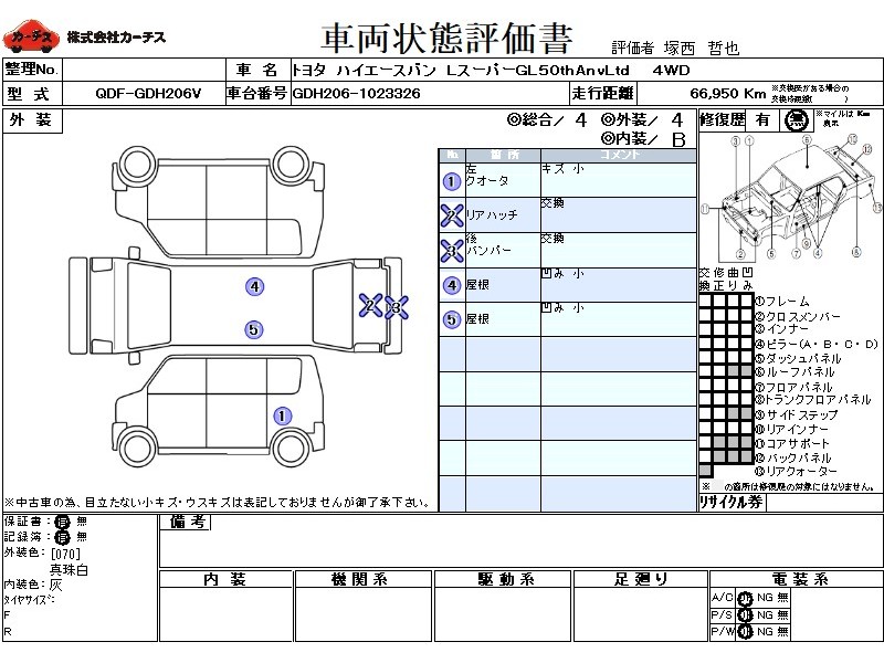 | メーカー・車種 | トヨタ ハイエースバン LスーパーGL50thAnvLtd (型式:QDF-GDH206V) | ||||||||||||||||||||||||||||||||||||||||