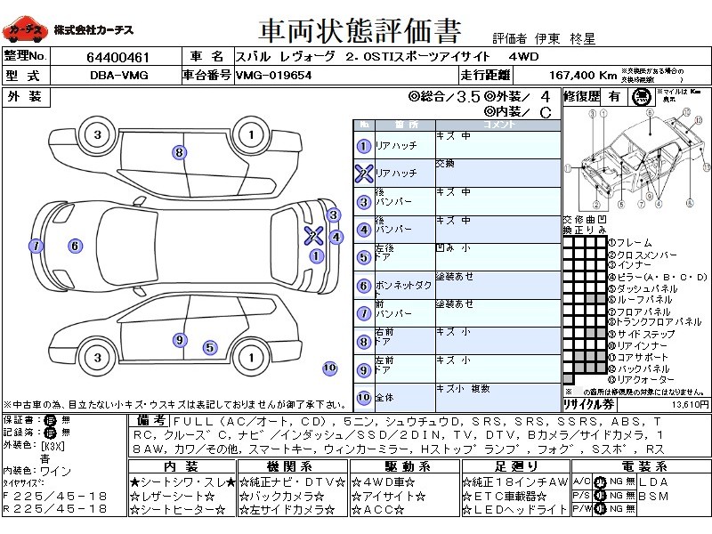 | メーカー・車種 | スバル レヴォーグ 2.0STIスポーツアイサイト (型式:DBA-VMG) | ||||||||||||||||||||||||||||||||||||||||