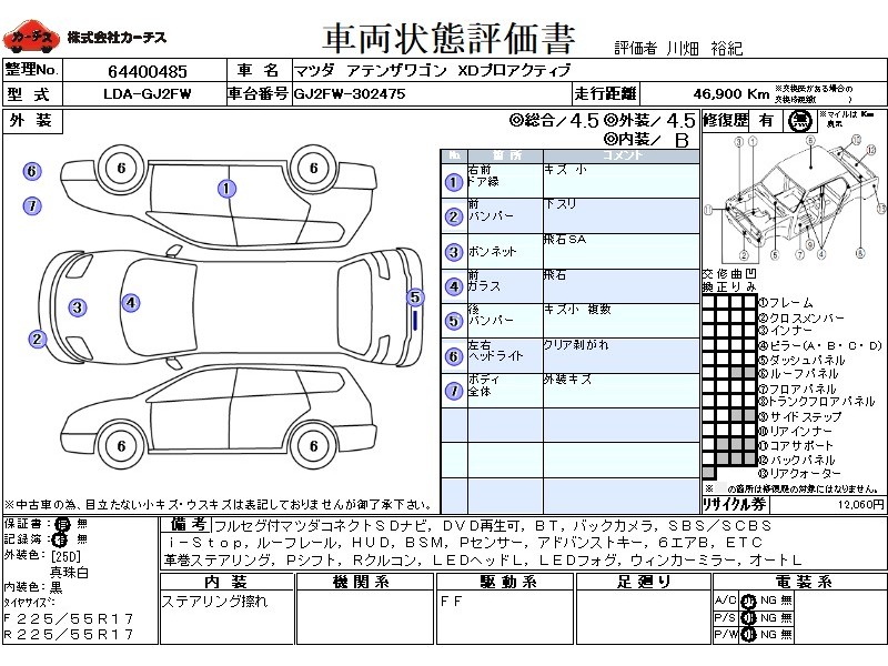 | メーカー・車種 | マツダ アテンザワゴン XDプロアクティブ (型式:LDA-GJ2FW) | ||||||||||||||||||||||||||||||||||||||||