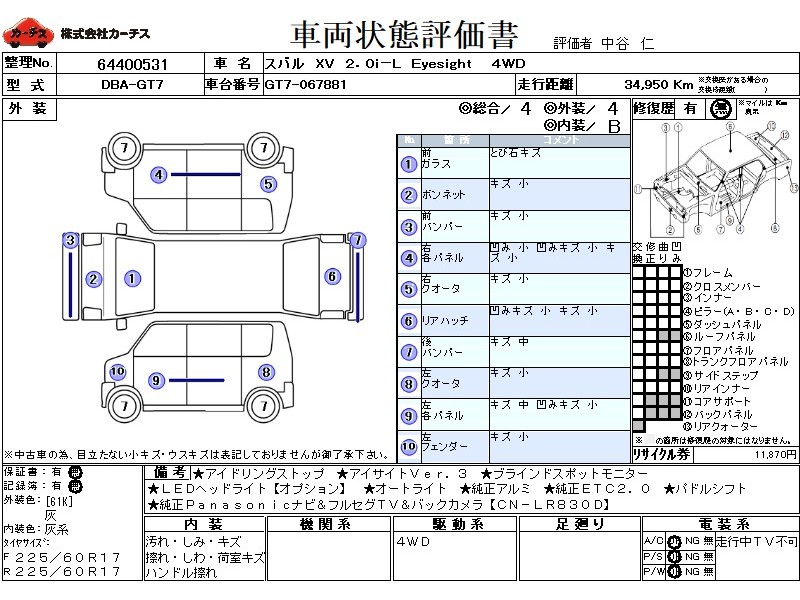 | メーカー・車種 | スバル XV 2.0i-Lアイサイト (型式:DBA-GT7) | ||||||||||||||||||||||||||||||||||||||||