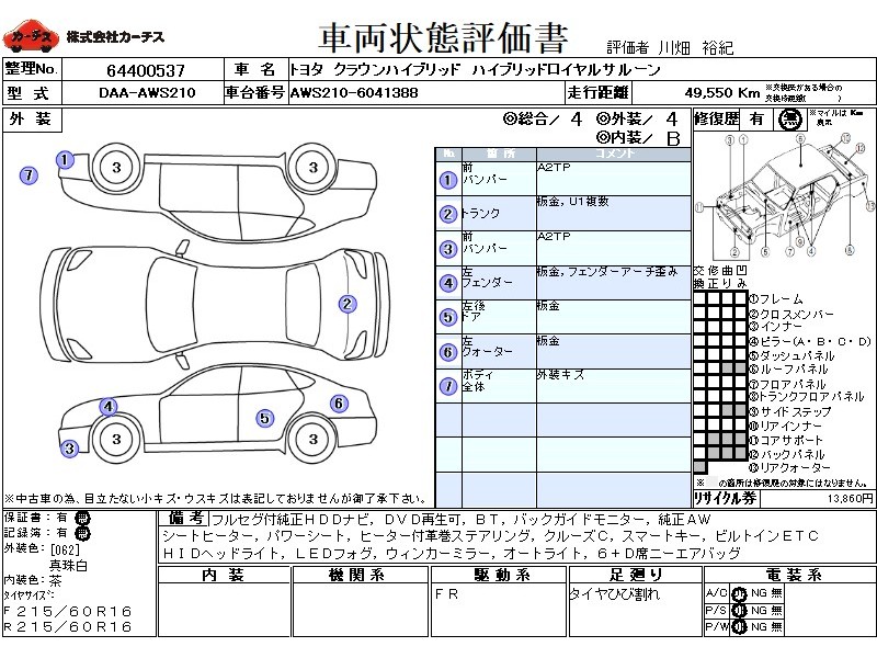 | メーカー・車種 | トヨタ クラウンハイブリッド ハイブリッドロイヤルサルーン (型式:DAA-AWS210) | ||||||||||||||||||||||||||||||||||||||||