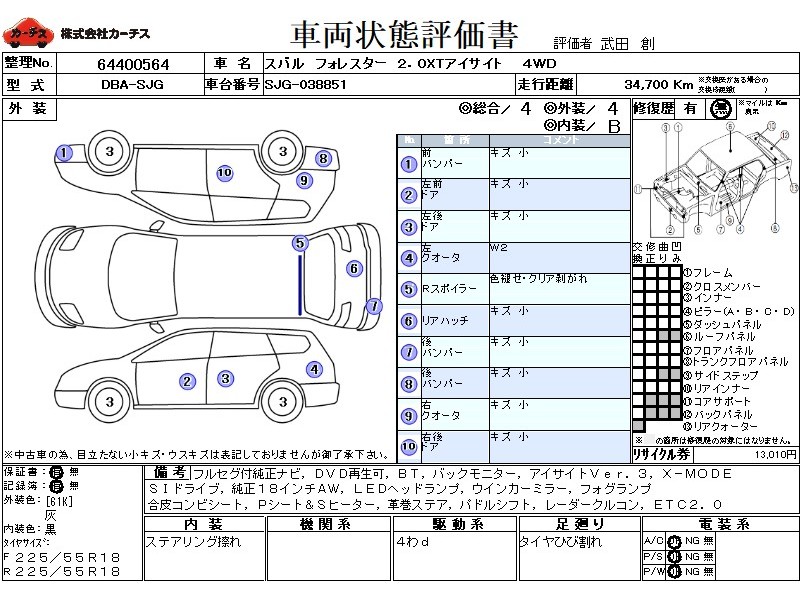 | メーカー・車種 | スバル フォレスター 2.0XTアイサイト (型式:DBA-SJG) | ||||||||||||||||||||||||||||||||||||||||