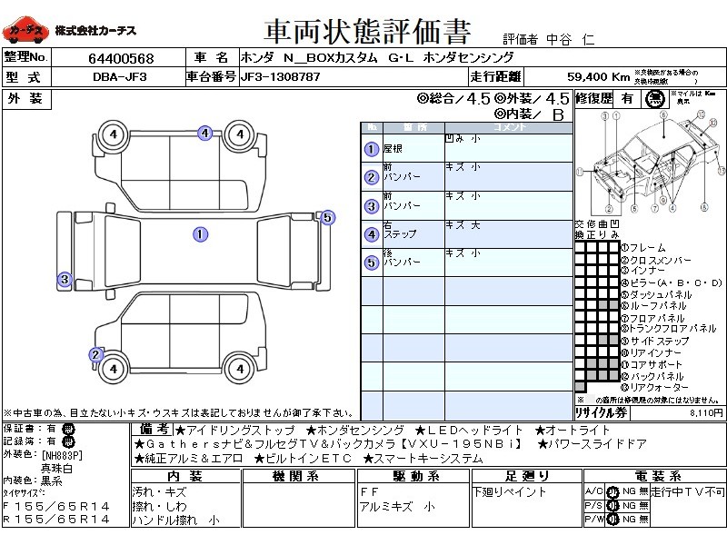| メーカー・車種 | ホンダ N BOXカスタム G・Lホンダセンシング (型式:DBA-JF3) | ||||||||||||||||||||||||||||||||||||||||