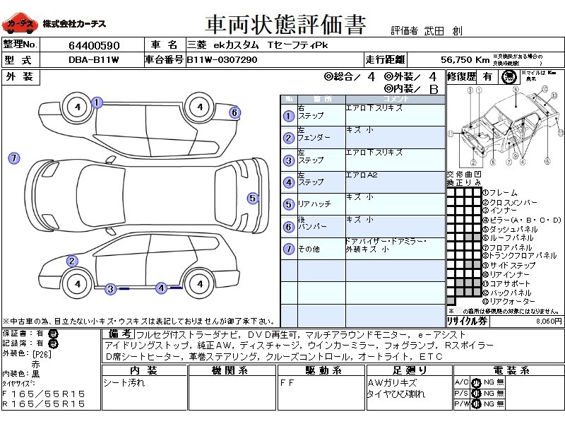 | メーカー・車種 | 三菱 ekカスタム TセーフティPk (型式:DBA-B11W) | ||||||||||||||||||||||||||||||||||||||||
