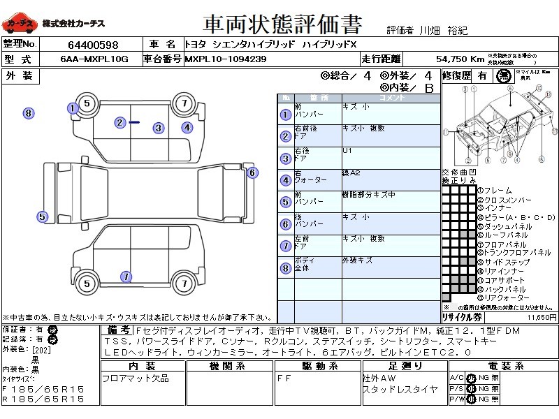 | メーカー・車種 | トヨタ シエンタハイブリッド ハイブリッドX (型式:6AA-MXPL10G) | ||||||||||||||||||||||||||||||||||||||||