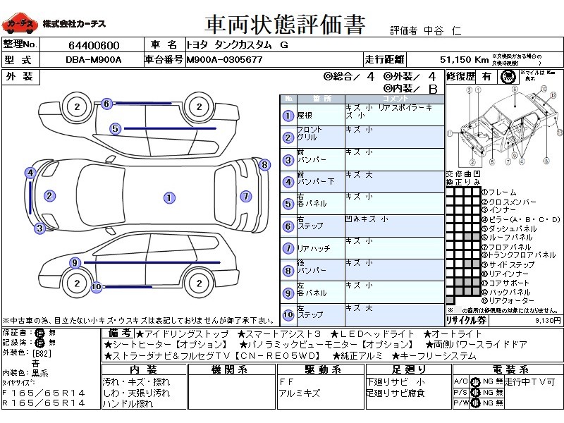 | メーカー・車種 | トヨタ タンクカスタム カスタムG (型式:DBA-M900A) | ||||||||||||||||||||||||||||||||||||||||