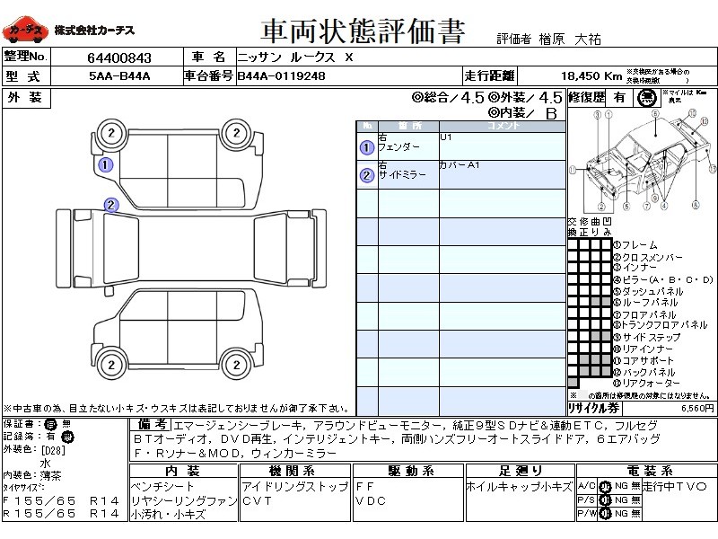 | メーカー・車種 | 日産 ルークス X (型式:5AA-B44A) | ||||||||||||||||||||||||||||||||||||||||